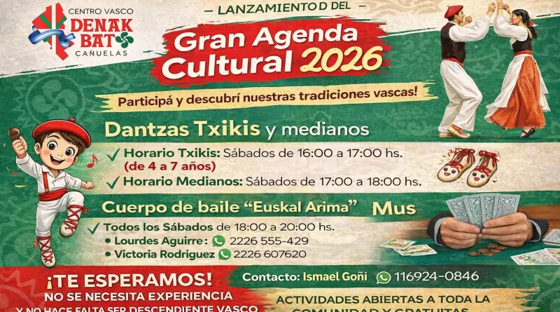 Con el regreso de la actividad habitual tras el receso estival, las instituciones de Cañuelas vuelven a poner en marcha su calendario anual. Entre ellas, el histórico Centro Vasco Denak Bat ya presentó su cartelera 2026, con una agenda que combina tradición, música, danzas y espacios abiertos para toda la comunidad.