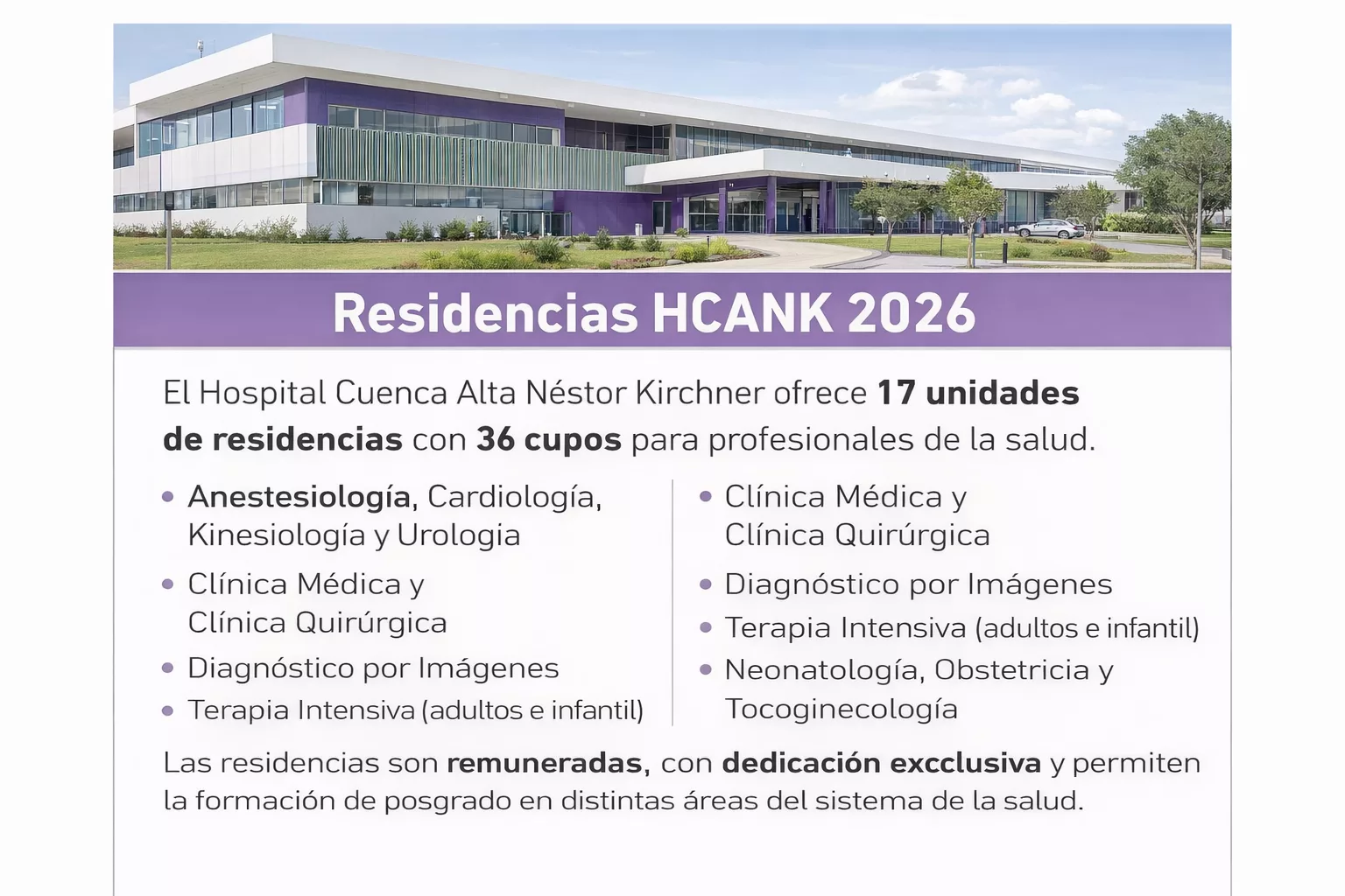 El Hospital Cuenca Alta Néstor Kirchner (HCANK) continúa consolidándose como un centro de referencia en la región al disponer de 17 unidades de residencias con un total de 36 cupos destinados a profesionales de la salud, en el marco de su política de formación de recursos humanos. canuelas.ya