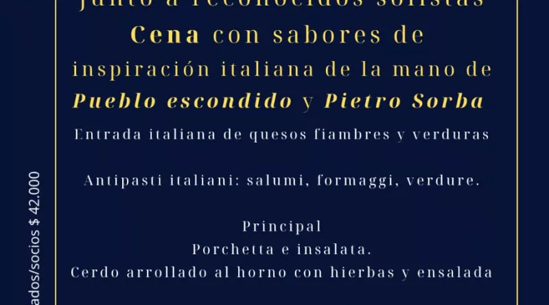 La velada artística estará a cargo del Coro de la Sociedad Italiana junto a reconocidos solistas. La cena ofrecerá sabores de inspiración italiana de la mano de Pueblo Escondido (Uribelarrea), con curaduría gastronómica de Pietro.