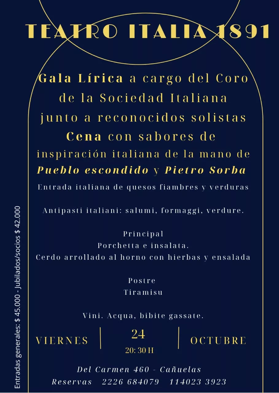 La Sociedad Italiana de Cañuelas organiza una gran Gala Lírica con cena este viernes 24 de octubre, en el Teatrito de Del Carmen 460, con propuesta gastronómica italiana y música en vivo.